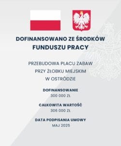Gmina Miejska Ostróda pozyskała dofinansowanie z Funduszu Pracy w wysokości 300 000 zł na realizację zdania pn. Przebudowa placu zabaw przy Żłobku Miejskim w Ostródzie z Resortowego Programu „Aktywne Place Zabaw” 2025. Całkowity koszt tej inwestycji to 306 000 zł, z czego 6 000 zł to środki własne gminy.